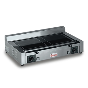 Piastre con struttura in acciaio inox AISI 430, piani di cottura in vetroceramica, controllo riscaldamento piano cottura tramite simostato affiancato da una lampada spia che segnala l'avvenuto passaggio di tensione e piedini regolabili in altezza per un maggior adeguamento allo spazio di lavoro.